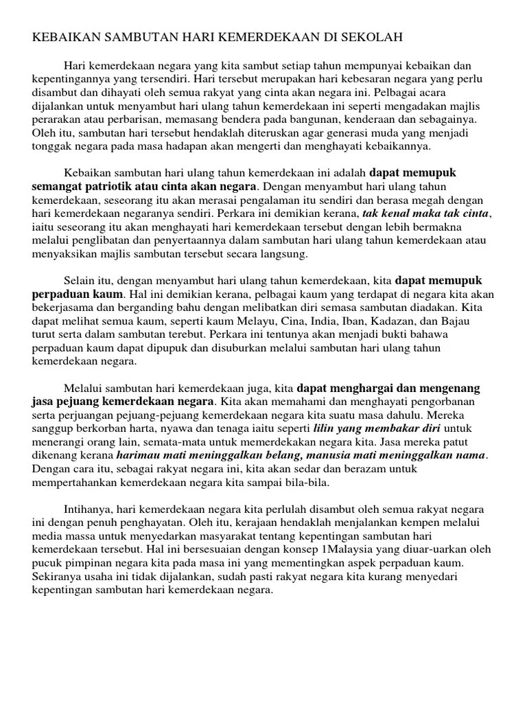 Lazimnya sambutan hari kebangsaan diadakan di dataran merdeka namun sejak kebelakangan . Berikut dikongsikan dua contoh karangan spm berkaitan pentingnya sambutan bulan kemerdekaan dan hari malaysia kepada rakyat malaysia yang . Kebaikan sambutan hari kemerdekaan di sekolah pengalaman menyaksikan sambutan hari kebangsaan contoh karangan sambutan hari kemerdekaan di sekolah.